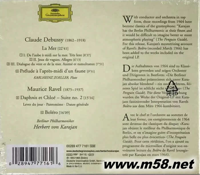 卡拉揚指揮DEBUSSY:LA MER 德彪西:大海 RAVEL:DAPHNIS ET CHLOF 大禾花版(m58.net) 2009年《企鵝古典唱片指南》中推薦為四星。 作為十八、十九世紀歐洲精英文化象征的古典音樂,它的受眾面受到一定的限制是毫不奇怪的,然而,有一位音樂家的名字,幾乎無人不知、無人不曉,他就是20世紀最偉大的指揮家之一、有“指揮皇帝”之稱的赫伯特?馮?卡拉揚(Herbert Von Karajan)。1908年,卡拉揚出生在奧地利的薩爾茨堡,偉大的作曲家莫扎特也誕生在這里。 交響音畫《大海》作于1905年3月,初演于1905年10月,是德彪西最大的一部交響音樂作品,由三個不同內容的樂章組成,它表現了“大海”的景色及其富有動態的性格,并通過整個樂隊的不同音區,極為強烈地表現出“大?!敝懈鞣N畫面的色彩。新穎的和聲、短小的旋律、豐富的音色、自由的發展,這些印象派的手法,都生動地刻畫出了一幅幅大海的生動畫面。 在這張《德彪西:大?!返膶]嬂?,卡拉揚指揮的柏林愛樂樂團(Berliner Philharmoniker)結構嚴整緊湊,氣勢磅礴雄偉,充滿激情??ɡ瓝P的身上散發出一種超人的藝術氣質和魔術師般的感召力,能夠將每一個樂手、演員甚至聽眾情不自禁地吸引到他的藝術創造中。他對音響力度的變化、音樂線條的勾勒與控制極其講究,善于創造華麗、流暢、透明、豐潤的管弦樂色彩效果,給人以輝煌精致的藝術享受。 作為屈指可數的歌劇指揮權威,卡拉揚擅長演繹威爾第、普契尼、瓦格納和理查?施特勞斯的歌劇作品,光是歌劇保留曲目就不下五十種。但他表示,不過70歲,絕不指揮《帕西法爾》、《法斯塔夫》,可見他在藝術追求上的執著和嚴肅。 對于年輕的藝術家,卡拉揚也是一個少有的“伯樂”,他提攜、幫助了很多的音樂家,其中有他的接班人阿巴多,有祖賓?梅塔、卡列拉斯等,還包括我國的湯沐海。他的日本弟子小澤征爾對他懷有刻骨銘心的感激之情。 “曲終人不見,江上數峰青”。一代“指揮皇帝”卡拉揚生前錄制了八百余張唱片,留下了三億美元的遺產。然而,他留給后人的何止是這些?他在20世紀世界指揮藝術史上開創了一個時代,他創造性地演繹著歐洲古典音樂,是人類文化寶庫中一筆永恒的財富。