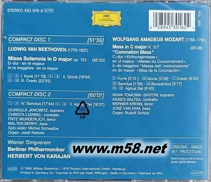 貝多芬:莊嚴彌撒;莫札特:加冕彌撒 BEETHOVEN MISSA SOLEMNIS MOZART CORONATION MASS (DG雙碟)(m58.net) 本片是卡拉揚完成於1966年的著名錄音,他一生中共完成過三次此曲的錄音,這份錄音由於有令人懷念的溫德利希,而特別令人喜愛。企鵝評鑑認為這份錄音「合唱團和獨唱家的演唱都極為優秀,之前出現的錄音都沒有這部作品出色。那種貝多芬特有的個性,在這里表達得相當深刻。它將一部傳統宗教作品,轉化成一種人性的信念。雅諾薇茲的聲音比她為卡拉揚在EMI的錄音還要美,當然溫德利希的演唱更是迷人、充滿英雄氣質,是這位男高音最偉大的錄音之一!」