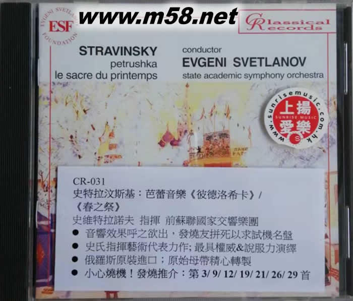 斯特拉汶斯基芭蕾音樂 史維特拉諾夫指揮Stravinsky: Petrushka & The Rite of Spring(m58.net) 史特拉汶斯基:芭蕾音樂<<彼德洛希卡>>/<<春之祭>>史維特諾夫 指揮 前蘇聯同學交響樂團 音樂效果呼之欲出,發燒友拼死以求試機名盤 史氏指揮藝術代表作:最具權威&說服力之演繹 俄羅斯原裝進口:原始母帶精心轉制 小心燒機!推出曲:第3/9/12/19/21/26/29首