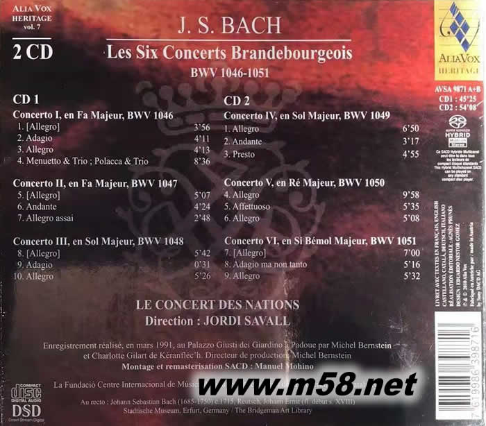Bach - Les Six Concerts Brandenbourgeois 巴赫 : 古樂版 布蘭登堡協奏曲全集 2 SACD(m58.net) 沙瓦爾 指揮 Le Concert des Nations 古樂團 多位古樂名家滙聚,; 優雅趣致,古意盎然 最佳性價比銘盤(2SACD/ 單碟價) ; 同獲古樂界與歐洲音樂傳媒一致好評 法國原裝進口;發燒級錄音
