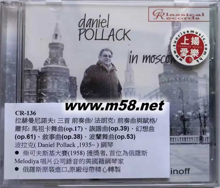 DANIEL POLLACK in Moscow(m58.net) 拉赫曼尼諾夫: 三首 前奏曲/ 法朗克: 前奏曲與賦格/蕭邦: 馬祖卡舞曲(op.17)、詼諧曲(op.39)、幻想曲(op.61)、敘事曲(op.38).波蘭舞曲(op.53) 柴可夫斯基大賽(1958) 獲獎者, 首位為俄羅斯Melodiya唱片公司錄音的美國籍鋼琴家 俄羅斯原裝進口,原廠母帶精心轉製