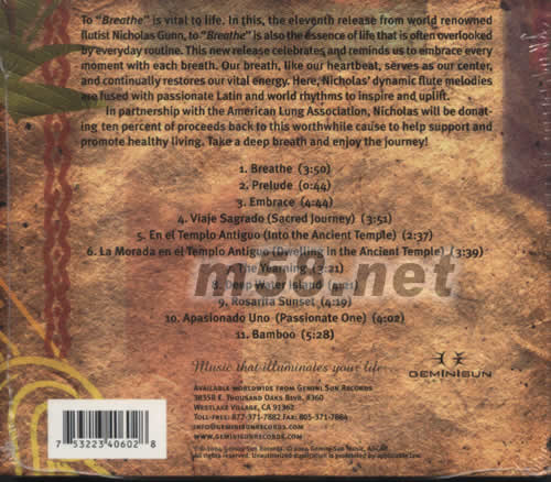 循環(huán)不息 擁有健康的生命并不是理所當(dāng)然的事.著名多才樂手NICHOLAS GUNN有感而發(fā),利用長笛\敲擊\鋼琴等多樣樂哭將有活力的韻律注入拉丁樂,以[呼吸]為題帶出生命的可貴,喻音人們抱緊呼吸的每一刻.更將此碟一成收益捐贈(zèng)美國肺臟協(xié)會(huì),這是令人振奮的發(fā)燒音樂. 1.BREATHE 2.PRELUDE 3.EMBRACE 4.VIAJE SAGRADO(SACRED JOURNEY) 5.EN EL TEMPLO ANTIGUO(INTO THE ANCIENT TEMPLE) 6.LA MORADA EN EL TEMPLO ANTIGUO(DWELLING IN THE ANCIENT TEMPLE) 7.THE YEARNING 8.DEEP WATER LSLAND 9.ROSARITA SUNSET 10.APASIONADO UNO(PASSIONATE NOE) 11.BAMBOO