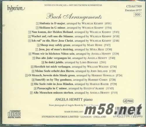 巴赫 鋼琴作品(m58.net) 安吉拉.赫維特崛起於一九八五年多倫多國(guó)際巴哈鋼琴大賽,這份殊榮讓她灌錄了一張巴哈鋼琴作品錄音,成為該年度最暢銷的巴哈專輯。然她的鋼琴技藝因此讓人們?cè)陬櫊柕轮?再度相信加拿大是現(xiàn)代巴哈鋼琴家們的產(chǎn)地,拉威爾本身雖然并非展技鋼琴家,卻為樂壇留下最能夠掌握到鋼琴本質(zhì),甚至技巧最艱難的鋼琴音樂。 自從安吉拉.赫維特Angela Hewitt在加拿大國(guó)際巴哈鋼琴大賽中獲勝,她就被認(rèn)為是巴哈音樂的權(quán)威鋼琴家。 安吉拉.赫維特從三歲開始學(xué)習(xí)鋼琴,九歲在多倫多皇家音樂會(huì)堂首次登臺(tái)演奏。同時(shí)她也學(xué)習(xí)小提琴丶直笛丶聲樂以及古典芭蕾,但是對(duì)鋼琴的狂熱興趣使她最終選擇了這項(xiàng)樂器。 在這近二十年里,安吉拉.赫維特在世界各地?fù)碛袩o數(shù)樂迷,并享有極高的聲譽(yù)。她的樂思精致細(xì)膩,技巧在各個(gè)曲目皆游刃有馀,極受樂評(píng)激賞。無疑地,她是巴哈的專家,但她同時(shí)也專精於拉威爾及梅湘音樂里那有力的旋律。短短數(shù)年內(nèi),她在Hyperin錄制了巴哈幾乎所有的鋼琴作品。 鋼琴才女安琪拉.赫威特出身加拿大音樂世家,父親是渥太華大教堂管風(fēng)琴師。她先後從多倫多皇家音樂院和渥太華大學(xué)畢業(yè)之後,迅速竄紅,被肯定為當(dāng)今最優(yōu)秀的巴哈詮釋者,1995年獲頒渥太華大學(xué)榮譽(yù)博士學(xué)位。安琪拉.赫威特上次所灌錄的巴哈「郭德堡變奏曲」,不但成為世界各大重要音樂雜志當(dāng)月最佳推薦盤,也被提名Gramophone唱片大獎(jiǎng)。這張新片選錄鋼琴大師肯普夫,著名作曲家華爾頓丶艾爾蘭丶霍威爾,英國(guó)前輩鋼琴家米拉海斯丶柯罕丶霍威丶尤金狄阿伯特丶鮑爾,以及赫威特自己所改編的巴哈作品(取材自清唱?jiǎng)∝际ピ佖奸L(zhǎng)笛奏鳴曲和管風(fēng)琴曲)。整個(gè)演奏不只令人愉悅,還繼續(xù)滋生新鮮美感,喚起驚嘆,難怪華格納要說:「巴哈作品乃是所有音樂之中最偉大的奇跡!