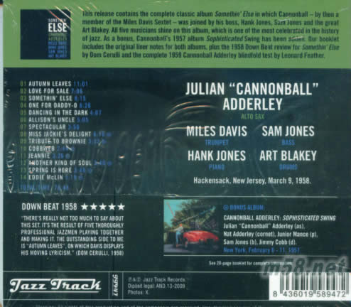Julian Somethin' Else(m58.net) This release contains the complete classic Blue Note album "Somethin' Else" in which Cannonball - by then a member of the Miles Davis Sextet - was joined by his boss, Hank Jones, Sam Jones and the great Art Blakey. All five musicians shine on this album, which is one of the most celebrated in the history of jazz. As a bonus it's added Adderley's 1957 Mercury classic album "Sophisticated Swing" which appears here complete with the sole exception of a short trio version of 'Stella by Starlight' (played only by the rhythm section, without Cannonball or Nat), which could not be included due to time limitations. Our booklet includes the original liner notes for both albums, plus the 1958 Down Beat review for Somethin' Else by Dom Cerulli and the complete 1959 Cannonball Adderley blindfold test by Leonard Feather, which also appeared on Down Beat magazine.