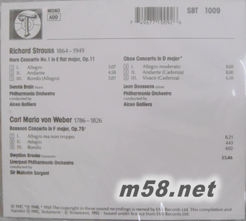 施特勞斯管樂協奏曲GWYDION BROOKE DENNIS BRAIN LEON GOOSSENS(m58.net) 指揮:SIR MALCOLM SARGENT Dennis Brain - horn 喇叭 Leon Goossens - oboe 雙簧管 Gwydion Brooke - bassoon 巴松管 首度出版于1947年