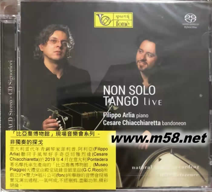 比亞喬博物館 現場音樂會系列 - 非獨奏的探戈Live At Museo Piaggio - NON SOLO TANGO Live(鋼琴與手風琴) SACD(m58.net) Filippo Arlia (鋼琴) Cesare Chiacchiaretta (手風琴) 奇亞切雅列達手風琴,演奏:皮亞佐拉/保卡洛夫/曼奇尼作品,殿堂級錄音大師里茲錄音,現場實況,精彩絕倫 1. 意大利當代年青鋼琴家菲利普.阿利亞(Filippo Arlia)以十七歲之齡畢業於維博瓦倫蒂亞(Vibo Valentia)的F. 托雷弗蘭卡音樂學院(Conservatory of Music F. Torrefranca),師隨名鋼琴家安東內拉.巴巴羅薩(Antonella Barbarossa),音樂天份極高的他以彈奏優雅流暢,音色明亮清晰見稱,能演多種類別的音樂,活躍於歐洲樂壇。