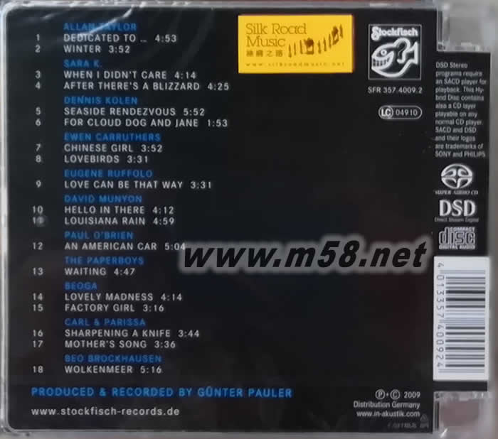 老虎魚精選SACD CLOSER TO THE MUSIC 第三輯(m58.net) 老虎魚 精選SACD第3輯 最貼近原樂器及人聲的監聽天碟第3輯,集合多位樂迷最鐘愛的殿堂發燒歌手包括莎拉.k阿倫,泰勒,伊梵??敺?,葉根,魯福洛,大衛??娪海八蛨笸€有新加盟 老虎魚 實力派歌手保羅。奧布林(paul obrien),比奧,布洛侯森(beo brockhausen)與及組合“卡爾和巴里斯薩(car&parissa)"等。部分歌曲更是首度暴光,讓樂迷能先聽為快,首首超水準備之作配合,老虎魚 專業錄音師悉心制作,堪稱完美的SACD制式范組合,震撼登場!