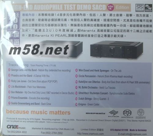 MARANTZ鑒聽王2010 SACD終極示范級測試天碟第十二集(限量版)(m58.net) 本專輯收錄14首多元化音樂內容,包括:人聲,爵士音樂,敲擊,地方民謠,古典音樂,歌劇等必備試機元素;特別在人聲的真確度,現場空間感,尤其是在各種不同樂器的立體聲定位方面都加以強化,無論是在訊噪比或動態范圍內每一分貝,都能精確地顯現出來。[監聽王2010年度精選]是MARANTZ 高級音響指定的第十二輯之示范軟件,更是MARANTZ KI PEARL 頂級音響器材度身打造之專屬示范天碟。