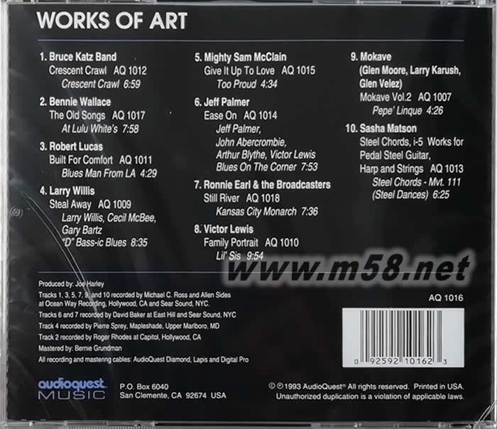 燒上燒2 Works of Art Vol. 2(m58.net) 美國線圣AUDIOQUEST是發燒線大廠,也是錄音名牌,本CD從旗下幾張發燒專輯中每張精選一首歌曲合輯而成,猛人名曲云集的一張合輯,是試機的好幫手!