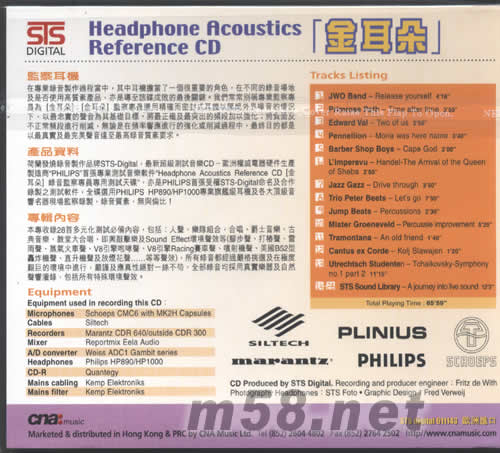 監(jiān)察耳機(jī) 在專(zhuān)業(yè)錄音制作過(guò)程當(dāng)中,其中耳機(jī)擔(dān)當(dāng)了一個(gè)很重要的角色,在不同的使用高質(zhì)素產(chǎn)品,蠻是導(dǎo)致該碟為敗的最后關(guān)鍵。我們常常別稱(chēng)專(zhuān)業(yè)監(jiān)察專(zhuān)員為[金耳朵];[金耳朵]監(jiān)察專(zhuān)員選取用精確而密封式耳機(jī)以隔絕外界噪音的情況下, 以最忠實(shí)的聲音為其基礎(chǔ)目標(biāo),將最正確及最突出的頻段加以強(qiáng)化;將負(fù)面及不政黨頻段進(jìn)行削減,無(wú)論是在頻率進(jìn)行的強(qiáng)化或削減過(guò)程中,最終目的都是以最真實(shí)最完美聲音達(dá)到最高錄音質(zhì)素要求。 產(chǎn)品資料 荷蘭發(fā)燒錄音制作品版STS-DIGITAL,最新超大型級(jí)測(cè)試音樂(lè)CD-歐洲權(quán)威電器硬功夫件生產(chǎn)制作商PHILIPS首張專(zhuān)業(yè)測(cè)試音樂(lè)軟件“HEADPHONE ACOUSTICS REFERENCE CD[金耳朵]錄音監(jiān)員專(zhuān)用PHILIPS HP890/HP1000專(zhuān)業(yè)旗艦及各大頂級(jí)音響名器現(xiàn)場(chǎng)監(jiān)察錄制,錄音質(zhì)素,無(wú)與論與! 專(zhuān)輯內(nèi)容 本專(zhuān)輯疏錄28首多元化測(cè)試必備內(nèi)容,包括:人聲,合唱,爵士音樂(lè),古典音樂(lè),教堂大合唱,即與敲擊樂(lè)及SOUND EFFECT 環(huán)境聲效等(腳步步聲,打椿聲,雷雨聲,蒸氣火車(chē)聲,V8引擎咆哮聲,V8引擎RACING 賽車(chē)聲,噴射機(jī)聲,美國(guó)B52型轟炸機(jī)聲,直升機(jī)聲及放煙花聲……等等聲效)所有錄音都經(jīng)過(guò)嚴(yán)格挑選取及在極度艱巨的環(huán)境中進(jìn)行,嚴(yán)謹(jǐn)及應(yīng)真性絕對(duì)一絲不茍,全部錄音幸免采用真實(shí)樂(lè)器及自然聲響灌錄,包括所有特殊環(huán)境聲效。