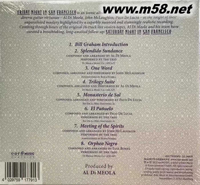 價格為估,以實到貨為準! SATURDAY Night in San Francisco(舊金山星期六之夜 三位吉它大師LIVE)CD(m58.net) 音響論壇劉漢盛先生「總編私房軟體」強力推薦! ★ 延續原音吉他經典傳奇,集結三位吉他界天王級大師,融合爵士、世界音樂、藍調完美結合! ★ 高超技藝與現場魅力,最強團隊呈現完美音效! ★ 嶄新包裝豪華現身,最具典藏價值的傳世之寶! 1981年發行的《舊金山的星期五之夜》,集結融合爵士吉他大師阿爾.迪.梅拉與約翰.麥克勞克林,再加上西班牙吉他大師帕科.德.盧西亞,造就了一張至今仍是音樂/音響界的原音吉他傳奇經典;其中融合爵士樂元素與搖滾,加上世界音樂、印度古典音樂、西方古典音樂,佛朗明歌、藍調等,三位高手的精湛競技更是令人眼花撩亂、擊節讚賞;爵士樂評論家Walter Kolovsky將其譽為「可能是所有原聲吉他專輯中最有影響力的」。如今,Impex唱片公司終於推出後續作品《舊金山週末夜》,延續經典音樂之旅! 在這張專輯之中,阿爾.迪.梅拉率領他的團隊,利用數小時的原始16軌現場錄音帶,將他和約翰.麥克勞克林與帕科.德.盧西亞於1980年12月6日在三藩市Warfield劇院所舉行的、充滿爆發能量的高超技藝演出,以最優異的音質呈現出來,Impex Records 與迪.梅拉與混音工程師Roy Hendrickson(SPIN工作室)、母帶工程師Bernie Grundman仔細合作,重現了現場演出的魔力,並使這些從未發行過的獨奏和三重奏曲目,迸發出驚人的清晰度、寬闊的動態與輝煌燦爛的音色。豪華的嶄新包裝、未曾問世的現場照片,如今以發燒級180克黑膠唱片發行,絕對值得珍藏! 前身“Friday Night In San Francisco”于 1980 年 12 月 5 日在舊金山的 Warfield 劇院錄制(最初于 1981 年發行),被認為是有史以來最成功的原聲吉他專輯之一。一張標志性的專輯,珍藏了三位傳奇而多樣的吉他演奏家 Al Di Meola、John McLaughlin、Paco De Lucia (1947-2014),在他們無與倫比的精湛技藝的巔峰時期,以極其細致入微和令人驚嘆的逼真錄音為亮點。 原創音樂會之所以如此具有里程碑意義,超越小眾觀眾,成為大眾產品,是爵士、融合、弗拉門戈和地中海音樂的獨特融合。 40年來,沒有人知道周六節目的錄制到現在!Al Di Meola 和他的團隊梳理了數小時的原始 16 軌現場錄音帶,策劃了令人嘆為觀止的后續行動:舊金山的周六之夜。