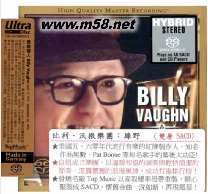 價格為估,以實到貨為準! BILLY VAUGHN & HIS ORCHESTRA GREENFIELDS 綠野 SACD(m58.net) 利沃恩是20世紀50年代到60年代初最有名氣的流行管弦樂隊指揮和流行音樂編曲家。事實上,他在那個搖滾年代中,比其他的管弦樂指揮大師擁有更多的頂尖作品。比利沃恩同時也在Dot Records創作了眾多標志性的作品,比如說:Pat Boone、the Fontane Sisters,還有Gale Storm。作為一名流行樂編曲家,他最大的特點就是干凈利落地把搖滾歌曲或R&B歌曲改編成主流樂曲。BillyVaughn也是一位錄音藝術家,他錄制了大量的輕音樂,器樂曲的專輯,這些專輯在整個60年代里都頗為流行。比利 沃恩從1952年開始了他成功的音樂生涯,于Don McGuire, Jimmy Sacca,以及Seymour Speigelman組成了一個四重唱的聲樂小組Hilltoppers。在1952年到1957年間,Hilltoppers擁有了大量的上榜單曲, Vaughn的“Trying”是他們這一系列成功的開始。在1955年,Vaughn離開了這個演唱小組,作為一名音樂導演參加了Dot Records。DotRecords在50年代流行的音樂,大部分都應歸功于沃恩,他重新編排了那些搖滾樂曲和R&B樂曲,使他們擁有了主流音樂的第二次生命。他在與Fontane Sisters的合作中取得了第一次的成功,她們演唱了Vaughn管弦樂隊所有的歌曲,包括1954年突破性歌曲"Hearts of Stone"。當然 Dot Records的最大成功是來自于Pat Boone。他擁有一系列由Vaughn重新改編的搖滾歌曲。
