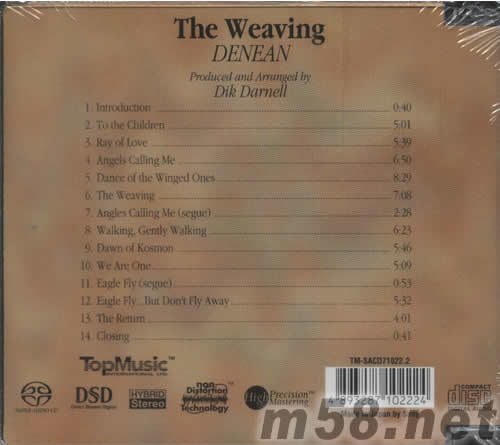 THE WEAVING織夢SACD(m58.net) DENEAN的《The Weaving織夢》《Thunder蝶舞春雷》大家都很熟悉,Denean是一位極具音樂才華的才女,在這專輯中還負責作曲、編曲、演唱鋼琴伴奏等工作,一塵不染的旋律及曼妙的伴奏,是全球一致叫好叫座的熱門金碟。 她的作品,無論旋律的編排,她的鋼琴演奏,更主要的她的演唱,都是非常實實在在,而沒有現在流行的音場的ECHO,或者添加電子合成器的渲染,就是靠著簡潔而優美的旋律,甜美而實質的歌聲來打動人,賦予每一首作品一個生命般充實的內涵和親切感。聽來如同茗品一盅濃厚的烏龍茶般的有質感。而那種甜美,卻是甜而不膩,當旋律已然淡去,卻依然有種回味,而余香仿佛依舊。 這是一張講述一個農家女的心情,充滿了對夢想的憧憬,未來的渴望,而有些曲目的名字,卻又像是一個男孩的感覺,比如eagle in my heart,tai chi好像不大會針對一個女孩子的而言,而like water和your own soul卻又像男孩子對女孩子的表白。但是,也可以描述位女孩子的內心活動,更因為是DENEAN的演唱,聽來偏女性化多點。繁瑣了,累了,只想閉上眼睛,不管內容了,只想聆聽一種喜歡,一種滋潤。這就是聆聽這張作品的最后結局.