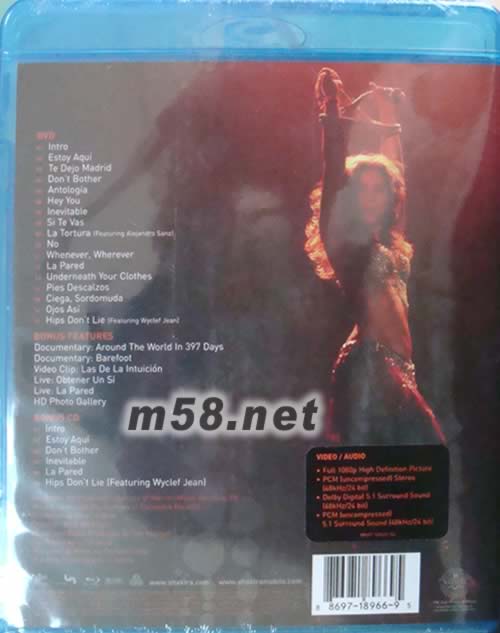 01. Intro 02. Estoy Aqui 03. Te Dejo Madrid 04. Don't Bother 05. Antologia 06. Hey You 07. Inevitable 08. Si Te Vas 09. La Tortura (Featuring Alejandro Sanz) 10. No 11. Whenever, Wherever 12. La Pared 13. Underneath Your Clothes 14. Pies Descalzos, Suenos Blancos 15. Ciega, Sordomuda 16. Ojos Asi 17. Hips Don't Lie (Featuring Wyclef Jean) Bonus Features: Documentary: Around The World In 397 Days Documentary: Barefoot Video Clip: Las De La Intuicion Live: Obtener Un Si Live: La Pared HD Photo Gallery Bonus CD: 01. Intro 02. Estoy Aqui 03. Don't Bother 04. Inevitable 05. La Pared 06. Hips Don't Lie (Featuring Wyclef Jean)