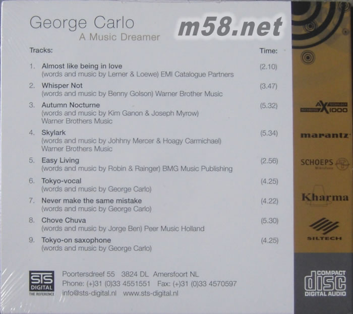 1.almost like being love (words and music by lirmer&loewe)emi catalogue patners 2.whisper not ((words and music by benny golson)warner brother music 3.autumn boctrtne (words and music by kim ganon&joseph myrow)warner brothers music 4.skylark (words and music by johhny mercer&hoagy carmichael)warner brothers music 5.easy living (words and music by robin&raingerbmg music publishing) 6.tokyo-vocal (words and music by george carlo) 7.never make the same mistake (words and music by george carlo) 8.chove chuva (words and music by jorge ben)peer music halland 9.tokyo-on saxophone (words and music by george carlo)