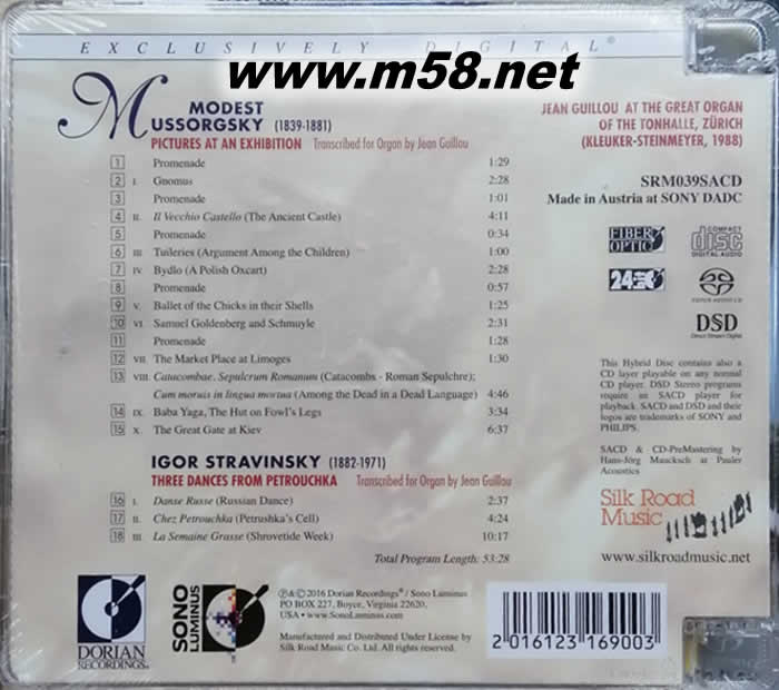 穆索爾斯基:圖畫展覽會 Pictures at an Exhibition 管風琴 SACD(m58.net) Jean Guillou (organ) 斯拉特文斯基:來自"彼特魯什卡"三首舞曲 Mussorgsky: Pictures at an Exhibition、 Stravinsky: Three Dances From Petrouchka 1. 此專輯於1988年只是以普通CD首次出版已在音響界引起了轟動,美國Stereophile音響雜誌曾將它列入“拼死以求”天碟榜中(r2d4 list)及TAS的極力推薦,這次以SACD為載體,以原裝母盤由「老虎魚」專業調較及加強,音效更趨完羌。 2. 專輯內兩位俄羅斯作曲家作品表現形式和其他同曲目的錄音版本有所不同,兩部作品都被改編為管風琴獨奏,欣 賞角度與效果和原作大異其趣。 3. 法國著名管風琴大師讓•古洛(Jean Guillou)的演奏保留了原作的精髓神韻,又將管風琴這“樂器帝王”的獨有音響 特性和宏偉的氣勢全面發揮出來,對於已經很熟悉這兩部作品的樂迷具有無比的吸引力,同時亦可從音樂欣賞角度 作出比較。 4. 改編后的《圖畫展覽會》曲式結構清新細致,管風琴奏出的樂音線條清晰凸顯,在演繹著名的《基輔大門(The Great Gate at Kiev)》樂章時,管風琴如咆哮般的沉穩音響震撼人心,有地動山搖, 氣勢磅礡的感覺,能量之強彷如能將聽音室即將摧塌,有人稱這演繹版本為“最具摧毀力的圖畫展覽會”,特別是以SACD制式為詮釋,深層的頻率與動感更為突出及震撼。 5. 來自"彼特魯什卡"三首舞曲輕快自然,節奏徐疾有致,音色圓潤明亮,層次分明。 Mussorgsky: Pictures at an Exhibition、Stravinsky: Three Dances From Petrouchka