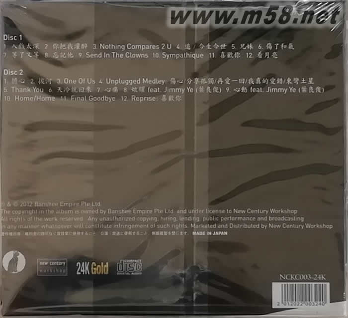 isc 1 1. 入戲太深 2. 你把我灌醉 3. Nothing Compares 2 U 4. 追 / 今生今世 5. 兄妹 6. 傷了和氣 7. 等了又等 8. 忘記他 9. Send in The Clowns 10. Sympathique 11. 喜歡你 12. 看月亮 Disc 2 1. 擔(dān)心 2. 拔河 3. One of Us 4. Unplugged Medley: 傷心/ 分享孤獨(dú)/ 再愛一回/ 我真的愛錯/ 東彎土星 5. Thank You 6. 天冷就回來 7. 心痛 8. 炫耀 [featuring葉良俊] 9. 心動 [featuring葉良俊] 10. Home 11. Final Goodbye 12. Reprise: 喜歡你