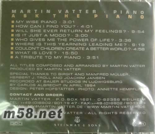 ASK THE PIANO黑鋼琴(m58.net) MASTERING BY PAULER ACOUSTICS Martin Vatter (馬丁瓦特) 把鋼琴融合在心,體驗(yàn)出音樂的浪漫與激情,反射出他高度個(gè)人主義,強(qiáng)而有力之鋼音,多樣化的音樂元素像是靈魂的肉欲。 Ask The Piano(黑鋼琴)在德國西南部之路德威茲堡Bauer Studios包爾錄音室收錄,這是世界知曉之大錄音室,使用Neumann tube-microphone SM 69把美麗浪漫的60 年古董Steinway大三角model D鋼琴聲音完完全全記錄下來,錄音師Carlos Albrecht在發(fā)燒音樂界響徹云霄,他曾為Philip Glass、John McLanghlin Trio、John Pastorius、Bobby McFerrin及Ray Brown監(jiān)製與錄下相當(dāng)多之著名專輯。想要浪漫幻想鋼琴加完美之發(fā)燒音效…Ask The Piano 問問黑鋼琴?
