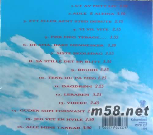 01. Ut Av Mitt Liv 02. Adle E Aleina 03. Ett Eller Aent Sted Derute 04. Vi Vil Vite 05. For Meg Tebage…. 06. De Sma, Rare Mennesker 07. Siste Sloledag 08. Sa Stille Det Er Blitt 09. Brudd 10. Tenk Du Pa Meg 11. Dagdrom 12. Leraren 13. Vibeke 14. Guden Som Forsvant 15. Jeg Vet En Hvile 16. Alle Mine Tankar