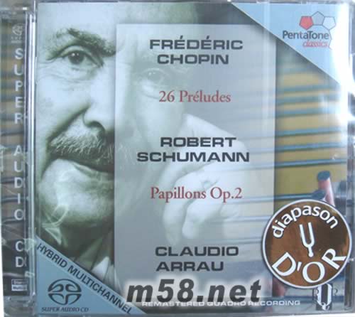 肖邦:24首前奏曲&舒曼:鋼琴套曲 蝴蝶 SACD(m58.net) 《肖邦:24首前奏曲&舒曼:鋼琴套曲”蝴蝶”》24首前奏曲是肖邦作品中演繹最多的經典,它的原意是取24種調作曲,鮮明表達各調的性格與氣氛。這套曲目充滿活力和跳躍感,顯示出肖邦鋼琴作品的華貴與舞步感覺!而舒曼的”蝴蝶”是其讀了約翰.保羅的書《妄自尊大的時期》的最后一章《描寫幼蟲之舞》后所創作的,套曲十分有情節感和敘事感,童話般地吸引著聽眾,仿佛你置身于其間!南美著名一代鋼琴宗師阿勞演奏!阿勞在柔版和鋼琴色彩上的詮釋是最到位的!SA-CD頂級制作!