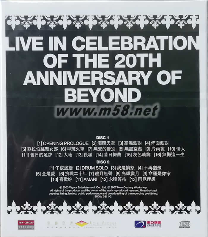 超越 03演唱會(huì) BEYOND LIVE 03 CD(m58.net) 一別廿年,黃家強(qiáng)、黃貫中及葉世榮再次以Beyond的身份踏足舞臺(tái),于4月30日起在香港紅館舉行一連五場Beyond成立20周年《BEYOND超越BEYOND LIVE 03演唱會(huì)》。是次演唱會(huì)最特別之處,乃Beyond三子花盡心思以投射影象方式讓逝世10周年的黃家駒重現(xiàn)舞臺(tái),與歌迷一同懷念樂隊(duì)的主音靈魂人物,站在臺(tái)中間的家駒臺(tái)風(fēng)依舊,他手拿結(jié)他與三子合唱演唱會(huì)主題曲「抗戰(zhàn)二十年」,場面感人。 在《超越Beyond Live 03 - Since 1983》卡拉OK影碟中,大家在這遍「大地」看到Beyond出道廿年「舊日的足跡」及「昔日的舞曲」,亦在「冷雨夜」里「不再猶豫」;盡管家駒作了「無聲的告別」,一眾Beyond樂迷仍以「永遠(yuǎn)等待」的心情向你講聲「喜歡你」,Beyond! 由于樂迷的熱烈要求,Beyond欲罷不能,再于6月21至23日在紅館再次舉行第二回《Beyond超越Beyond Live 03 II》,他們便希望將演唱會(huì)中部分的款項(xiàng)贈(zèng)給慈善機(jī)構(gòu)。