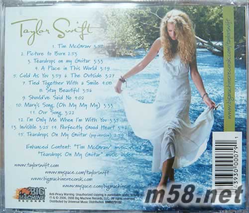 價(jià)格為估,以實(shí)到貨為準(zhǔn)! Taylor Swift CD+DVD 美國版(m58.net) 這張專輯十分不錯(cuò),Taylor Swift以自己的音樂素養(yǎng)演繹了一種流行搖滾樂和鄉(xiāng)村樂中和后的音樂作品,整張專輯很多曲目都是她自己操刀作詞,十分耐聽! 沒錯(cuò)Taylor Swift相對(duì)而言是一個(gè)新人,以出道單曲《Tim McGraw》一炮走紅,絕對(duì)是影響今后樂壇走勢的潛力股,值得關(guān)注的新人