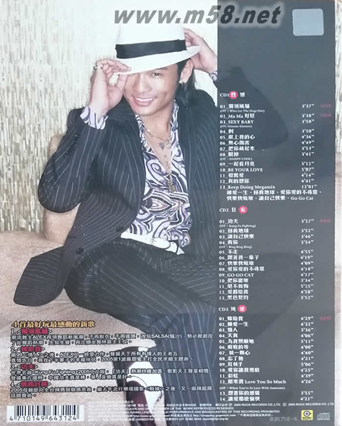 CD 1 - 性 01. 獨領(lǐng)風(fēng)騷 (New) 02. Mama好屌 (New) 03. Sexy Baby 04. 刺 05. 獻上我的心 06. 無心傷害 07. 把你藏起來 08. 脫掉 09. 一起看月亮 10. Be Your Love 11. 發(fā)現(xiàn)愛 12. 真的想你 (V.S. 順子) 13. keep doing mega mix CD 2 - 妄 01. 功夫 (New) 02. 拯救地球 03. 讓自己快樂 04. 救你 (V.S. Clon) 05. 不走 06. 跟著我一輩子 07. 快樂快燒壞 08. 愛你愛得不尋常 09. Go Go Cat 10. 把你寵壞 11. 絕不后悔 12. 愛都給我 (V.S. 黃嘉千) 13. 黑色契約 CD 3 - 愛 01. 嫁給我 (New) 02. 鐘愛一生 03. 情人 04. 天真 05. 為我照顧她 06. 癡癡的等 07. 放一顆心 08. 忘了他 09. 紅轎子 10. 愛你讓我勇敢 (V.S. 蘇慧倫) 11. 彩虹 12. 原來我 Love You So Much 13. 想著你的感覺 14 讓愛那么愉快