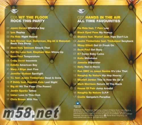 CD1: HIT THE FLOOR - ROCK THIS PARTY 01. Hason Derulo - Whatcha Say 02. Iyaz - Replay 03. Flo Rida - Right Round 04. Bob Sinclair feat Dollarman, Big Ali and Mekedah - Rock This Party 05. Akon feat Eminem - Smack That 06. Kat De Luna feat Elephant Man - Whine Up 07. Sean Paul - Temperature 08. Craig David - Insomnia 09. Estelle - American Boy 10. Mary J Blige - Just Fine 11. Jennifer Hudson - Spotlight 12. T.I. feat. Justin Timberlake - Dead & Gone 13. P. Diddy feat. Keyshia Cole - Last Night 14. Big Ali - Hit The Floor 15. Jordin Sparks - Tattoo 16. Usher - Love In This Club 17. Chris Brown - With You CD2: HANDS IN THE AIR - ALL TIME FAVOURITES 01. Flo Rida feat. T-Pain - Low 02. The Black Eyed Peas - My Humps 03. Shakira feat. Wyclef Jean - Hips Don't Lie 04. Justin Timberlake feat. Timbaland - Sexyback 05. Missy Elliott - Get Ur Freak On 06. Sean Paul - Get Busy 07. K7 - Come Baby Come 08. Kelis - Milkshake 09. Jamelia - Superstar 10. Nelly - Hot In Herre 11. Run DMC vs Jason Nevins - It's Like That 12. Naughty By Nature - Hip Hop Hooray 13. Montell Jordan - This Is How We Do It 14. Mark Morrison - Return Of The Mack 15. House Of Pain - Jump Around 16. Naughty By Nature - O.P.P. 17. Coolio - Gangsta's Paradise