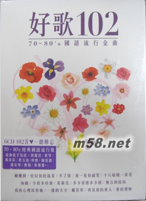 好歌102 70-80's國語流行金曲(m58.net) [好歌102] 70~80's國語流行金曲6CD 一曲難忘 陪你度過浪漫70~80年代最具代表性的經典歌典,位位天皇巨星轟動再現! 劉文正、費玉清、鳳飛飛、陳淑樺、齊豫、黃鶯鶯、費翔、潘安邦、銀霞、岳雷、鄧妙華、 甄秀珍、翁倩玉、尤雅、謝雷等巨星成名曲完整珍藏。收錄好歌102首經典金曲,包括: 一翦梅/費玉清、蘭花草/劉文正、再見我的愛人/鄧麗君、浪跡天涯/陳淑樺、今宵多珍重/蔡琴、 靠近一點/沈雁、喝釆/歐陽菲菲、海鷗/翁倩玉、外婆的彭湖灣/潘安邦、海闊天空/費翔、 恰似你的溫柔/費翔、珍重道別離/余天、我的心里沒有他/鳳飛飛、愛在飛揚/尤雅、 昨夜夢醒時/謝雷、…等一套6CD。 特別收錄: 一樣的天空 – 林淑蓉、李戊山 、鄉間的小路 – 齊豫、不了情 -蔡琴 特別推介: 橄欖樹 - 甄秀珍 、無言的結局 - 林淑蓉、樓湘靈、再見我的愛人 -鄧麗君