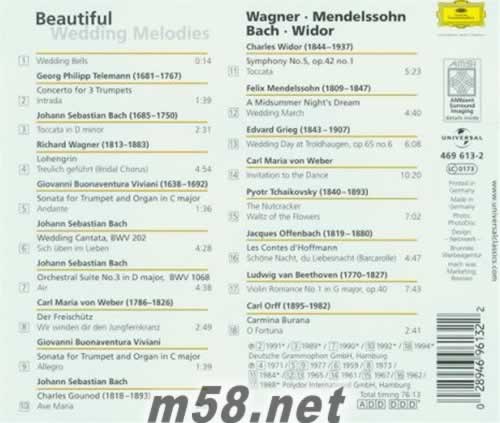 01.WEDDING BELLS 《婚禮鐘聲》 02.INTRADA FROM CONCERTO FOR 3 TRUMPETS (TELEMANN) 泰勒曼《3把小號協(xié)奏曲》引子 03.TOCCATA IN D MINOR (JS BACH) 巴赫《D小調(diào)托卡塔》 04.TREULICH GEFUHRT (BRIDAL CHORUS) FROM LOHENGRIN (WAGNER) 瓦格納《羅恩格林》婚禮合唱 05.ANDANTE FROM SONATA FOR TRUMPET AND ORGAN IN C MAJOR (VIVIANI) Viviani《C大調(diào)小號和管風(fēng)琴奏鳴曲》行板 06.SICH UBEN IM LIEBEN FROM WEDDING CANTATA BWV202 (JS BACH) 巴赫《婚禮康塔塔》 07.AIR 'ON THE G STRING' FROM ORCHESTRAL SUITE NO.3 IN D MAJOR BWV1068 (JS BACH) 巴赫《D大調(diào)第3樂隊組曲》詠嘆調(diào) 08.WIR WINDEN DIR DEN JUNGFERNKRANZ FROM DER FREISCHUTZ (WEBER) 韋伯《自由射手》用淡紫色絲綢為新娘編出花冠 09.ALLEGRO FROM SONATA FOR TRUMPET AND ORGAN IN C MAJOR (VIVIANI) Viviani《C大調(diào)小號和管風(fēng)琴奏鳴曲》快板 10.AVE MARIA (JS BACH/GOUNOD) 巴赫《啊 瑪麗亞》圣母頌 11.TOCCATA FROM SYMPHONY NO.5 OP.42 NO.1 (WIDOR) 維多爾《第5管風(fēng)琴交響曲》托卡塔 12.WEDDING MARCH FROM A MIDSUMMER NIGHT'S DREAM (MENDELSSOHN) 門德爾松《仲夏夜之夢》婚禮進行曲 13.WEDDING DAY AT TROLDHAUGEN OP.65 NO.6 (GRIEG) 格里格《特羅爾德豪根別墅的結(jié)婚日》之六 14.INVITATION TO THE DANCE (WEBER) 韋伯《邀舞》 15.WALTZ OF THE FLOWERS FROM THE NUTCRACKER (TCHAIKOVSKY) 柴科夫斯基《胡桃夾子》花之圓舞曲 16.SCHONE NACHT, DU LIEBESNACHT (BARCAROLLE) FROM LES CONTES D'HOFFMANN (OFFENBACH) 奧芬巴赫《霍夫曼的故事》威尼斯船歌 17.VIOLIN ROMANCE NO.1 IN G MAJOR OP.40 (BEETHOVEN) 貝多芬《G大調(diào)第1小提琴浪漫曲》 18.O FORTUNA FROM CARMINA BURANA (ORFF) 奧爾夫《啊 命運女神》博伊倫之歌