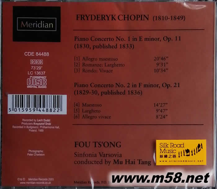CHOPIN 肖邦1-2鋼琴協奏曲作品(m58.net) 1934年出生於上海,父親傅雷是近代著名文學家,也是研究法國名作家羅曼羅蘭的專家,傅聰的幼年教育即由其父啟蒙。九歲跟隨馬力歐‧巴契(Mario Paci)學琴,1952年與上海工部局交響樂團演奏貝多芬鋼琴協奏曲「皇帝」,深獲好評。次年榮獲「布加勒斯特國際音樂大賽」鋼琴第三名,旋即隨「藝術訪問團」前往波蘭、東德與蘇聯等國訪問。同時受邀參加1955年在華沙舉辦的第五屆蕭邦鋼琴大賽,榮獲第三名以及最佳馬厝卡演奏獎,當屆第一名是波蘭籍的哈拉塞維契,第二名則是阿胥肯納吉。之后進入華沙音樂院專攻鋼琴,1956年學成返回北京,1958年移居倫敦且展開他輝煌的演奏生涯。他的演奏溫厚而富人性,并堅守自身文化根源,是華人鋼琴家之中最受人尊敬的偉大音樂家。 本輯於1989年錄於波蘭波哥士(Bydgoszcz)的愛樂廳,在優異的錄音之下襯托出大師隨心所欲的琴韻,無礙的技巧與巧妙的彈性速度,可謂蓋冠群倫的精采演奏。 傅聰/鋼琴 湯沐海指揮瓦索維亞交響樂團Sinfonia Varsovia 錄音:1989年,波蘭