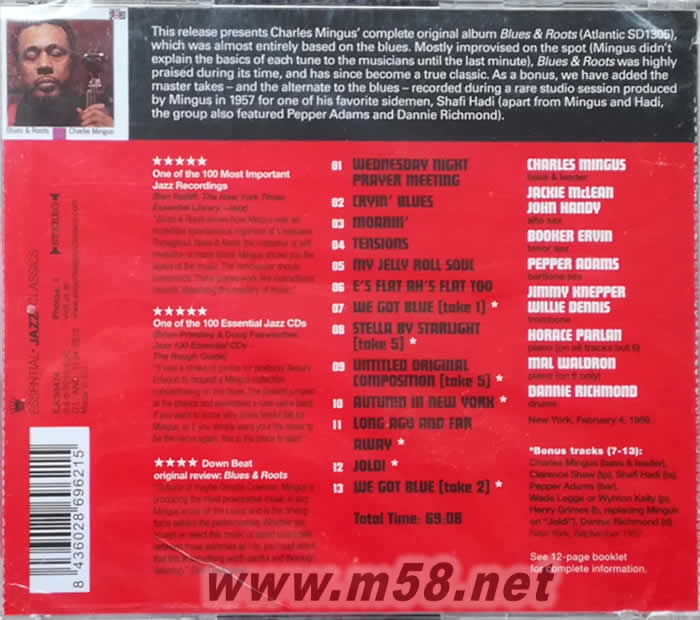 Blues & Roots 爵士貝斯手 (爵士大師五星系列)(m58.net) 數字修復的這張爵士樂專輯很棒。 包含Charles Mingus的完整原創專輯Blues&Roots,藍調作品。 大多是在現場即興創作(Blues&Roots在這段時間內受到高度贊揚,并且從此成為一個真正的經典。 作為獎勵,我們在1957年Mingus制作的一個罕見的演播室會議期間錄制了藍調的主奏和替補曲目,以供他最喜歡的副手之一Shafi Hadi設計,其中還包括Pepper Adams和Dannie Richmond。 基本爵士經典。Digitally remastered and expanded edition of this album from the Jazz great. Contains Charles Mingus' complete original album Blues & Roots, which was almost entirely based on the Blues. Mostly improvised on the spot (Mingus didn't explain the basics of each tune to the musicians until the last minute), Blues & Roots was highly praised during it's time, and has since become a true classic. As a bonus, we have added the master takes and the alternate to the Blues recorded during a rare studio session produced by Mingus in 1957 for one of his favorite sidemen, Shafi Hadi also featuring Pepper Adams and Dannie Richmond. Essential Jazz Classics.