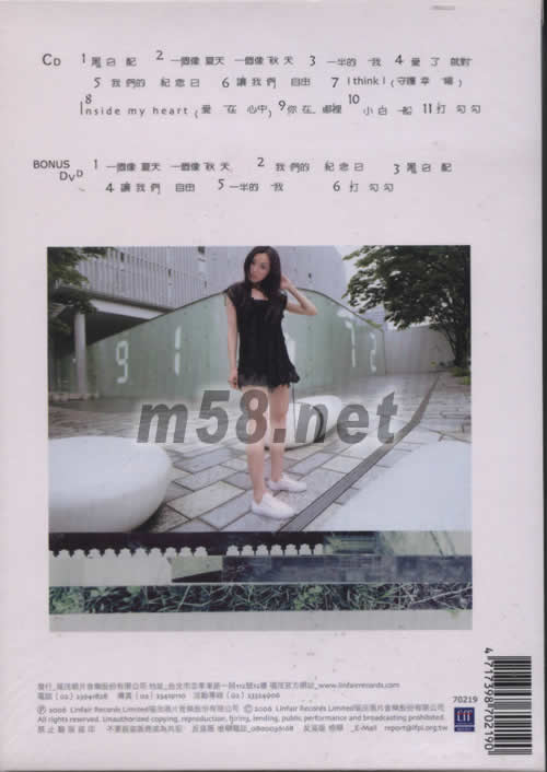 CD 01. 黑白配 02. 一個像夏天 一個像秋天 03. 一半的我 04. 愛了就對 05. 我們的紀念日 06. 讓我們自由 07. I Think I(守護幸福) 08. Inside My Heart(愛在心中) 09. 你在哪里 10. 小白船 11. 打勾勾 BONUS DVD 01. 一個像夏天 一個像秋天 02. 我們的紀念日 03. 黑白配 04. 讓我們自由 05. 一半的我 06. 打勾勾
