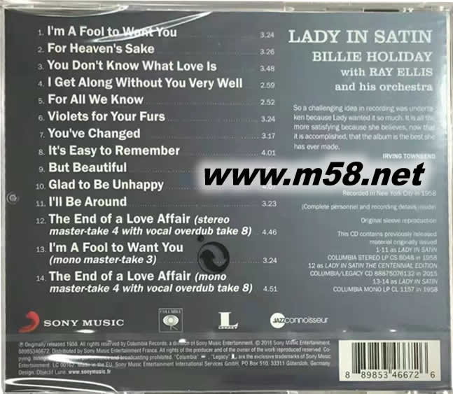 Lady In Satin 綢緞里的女人 (2016版)(m58.net) 美國Jazz 女歌手BILLIE HOLIDAY重發 1958年經典專輯 。 ,綢緞里的女人.在她有生之年的倒數第二張專輯里,在她最喜歡的一張專輯里,這個劣跡斑斑的女人,Billie Holiday,便是如此地稱呼自己.然而,在僅僅18個月之后,1959年的7月17日,她便因為酗酒在一片扼腕聲中如彗星般美麗而孤獨地隕落了.時年44歲. 在這張初版錄制于1958年的唱片中,Billie初入歌壇時的甜美醇厚的歌喉已不復現.取而帶之的是她歷盡人事滄桑后,透射著痛苦心境的沙啞嗓音.這不能愉悅你的神經,真的,相反的,在整張專集聽完之后,或許,你會為Billie這樣純粹直接地,或者說是赤裸裸的表現自己千瘡百孔的內心世界而泫然而泣.畢竟,能有如此坦誠,能有如此能力的藝術家,已經很少很少了.又或者,正是這坦誠,Billie才會把視為自己最喜歡的專輯吧. 專輯以一曲哀傷的"I'm a fool to love you"開場,便將聽者的心境緩緩地拖拽到情緒的地層,渲染出泛黃的憂郁回憶.而結尾曲"The End Of A Love Affair",更是反復的氤氳出悲傷的氣息,為這次錄音,這張唱片,或者說,是這一次的人生,悄然地劃上了一個句點. 1958年的版本,已經屬于彌足珍貴的無價之寶了.你我恐怕是無緣得見了.幸運的是SONY旗下的LEGACY,于1997年推出了的重制版.經過了高音質整理,并增加了4首于不同時期錄制的專輯歌曲版本.或許,能還原出一個更真實的Billie Holiday,能還原出她更真實的心境. 最喜歡的是長達9分多的"The End Of A Love Affair (The Audio Story)",因為里面有女藝人的清唱,喃喃自語,以及不知道是否開心的沙啞的笑.特別的是最后6秒的"Pause Track",聽的時候.拉上窗簾,靜靜地分享1958年,那間錄音室里的空氣. 在1997年版的唱片盒背面寫著這樣一句話:"LADY IN SATIN now wears a stunning new gown"(綢緞里的女人現在穿著一件精美的新禮服了)