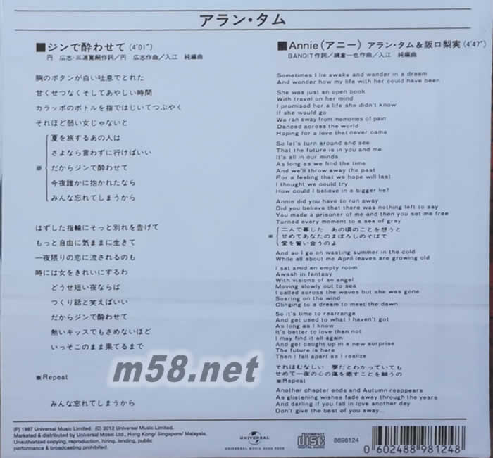 1.ジンで酔わせて (黑色快車 日文版) 2. Annie (アニー) 歌:アラン・タム/阪口梨実
