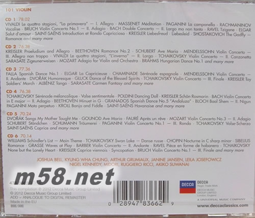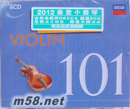 101 VIOLIN 101小提琴殿堂大師精選套裝 101古典系列6CD套裝 德版(m58.net) 2012全新101最愛系列 古典名廠牌DECCA超值6CD必備曲目,殿堂大師演繹 DECCA唱片官方試聽網址(片段): http://www.deccaclassics.com/cat/single?sort=newest_rec&PRODUCT_NR=4783662&SearchString=101&per_page=50&flow_per_page=50&presentation=flow&UNBUYABLE=1