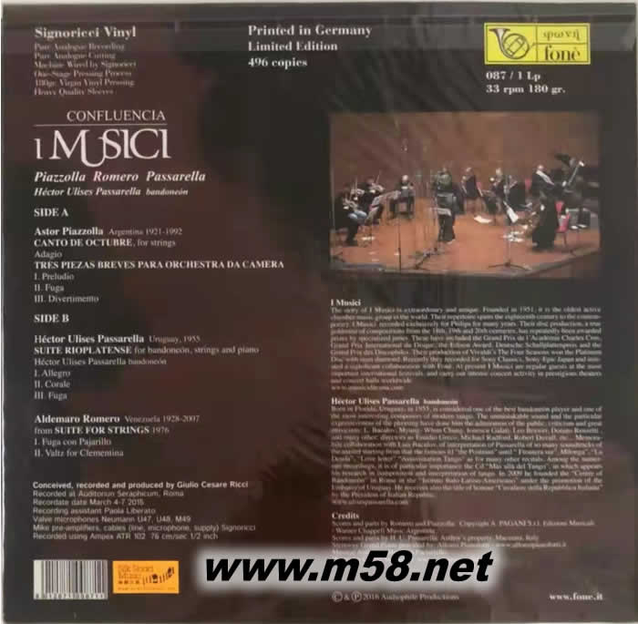 意大利音樂家合奏團[接連 CONFLUENCIA 黑膠(m58.net) 1. 譽滿全球室樂團「意大利音樂家合奏團」自六十週年紀念特輯 「維瓦爾迪:四季」后另一新作。 2. 樸質音色錄音系列 (natural sound recording) – 以現場實況收錄,不作后期修改調教,音色自然。 3. 演奏拉丁裔著名作曲家阿斯特‧皮亞佐拉(Astor Piazzolla), 阿迪馬羅·羅梅羅(Aldemaro Romero)及 赫克托‧烏利塞斯‧帕薩雷拉( Héctor Ulises Passarella)的精彩作品。