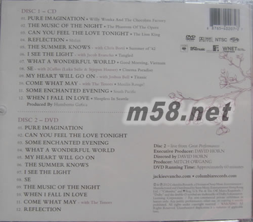DISK 1 CD 1. 1.PURE IMAGINATION –Willy Wonka And The Chocolate Factory 甜美幻境 (選自「歡樂糖果屋」,1971年第44屆奧斯卡「最佳原創或改編歌曲配樂」提名) 2. 1.THE MUSIC OF THE NIGHT –The Phantom Of The Opera 夜之樂章 (選自「歌劇魅影」,2004年第77屆奧斯卡「最佳原創歌曲」、「最佳藝術指導」、「最佳攝影」提名) 3. 1.CAN YOU FEEL THE LOVE TONIGHT –The Lion King 今晚你感受到愛了嗎 (選自「獅子王」,榮獲1994年第67屆奧斯卡「最佳原創歌曲」、「最佳原創配樂」大獎) 4. 1.REFLECTION –Mulan 倒影 (選自「花木蘭」,1998年第71屆奧斯卡「最佳音樂類或喜劇類原創配樂」提名) 5. 1.THE SUMMER KNOWS –Summer of ’42 夏天知我心 (葛萊美入圍傳奇小號手克里斯伯堤伴奏) (選自「往事如煙」,榮獲1971年第44屆奧斯卡「最佳原創配樂」大獎) 6. 1.I SEE THE LIGHT –Tangled 我看見了光明 (小賈姬與哥哥Jacob動人對唱) (選自「魔髮奇緣」,2010年第83屆奧斯卡「最佳原創歌曲」提名) 7. 1.WHAT A WONDERFUL WORLD –Good Morning, Vietnam 多美好的世界 (選自「早安越南」,1987年第60屆奧斯卡「最佳男主角」提名) 8. 1.SE –Cinema Paradiso 如果 (跨界大提琴雙人組「提琴雙杰」伴奏) (選自「新天堂樂園」,榮獲1989年第62屆奧斯卡「最佳外語片」大獎) 9. 1.MY HEART WILL GO ON –Titanic 愛無止盡 (葛萊美小提琴名家約夏貝爾伴奏) (選自「鐵達尼號」,榮獲1997年第70屆奧斯卡「最佳原創歌曲」共十一項大獎) 10. 1.COME WHAT MAY –Moulin Rouge 無論如何 (與加拿大美聲男高音合唱) (選自「紅磨坊」,榮獲2001年第74屆奧斯卡「最佳藝術指導」、「最佳服裝設計」大獎) 11. 1.SOME ENCHANTED EVENING –South Pacific 某個醉人的夜晚 (選自「南太平洋」,榮獲1958年第31屆奧斯卡「最佳音效」大獎) 12. 1.WHEN I FALL IN LOVE –Sleepless In Seattle 當我墜入情網 (選自「西雅圖夜未眠」,1993年第66屆奧斯卡「最佳原創歌曲」、「最佳原創劇本」提名) DISK 2 DVD 編號 曲名 試聽 1. 美國公視優質拍攝小賈姬「Music Of The Movies」電視演唱會 PURE IMAGINATION 2. CAN YOU FEEL THE LOVE TONIGHT 3. SOME ENCHANTED EVENING 4. WHAT A WONDERFUL WORLD 5. MY HEART WILL GO ON 6. THE SUMMER KNOWS 7. I SEE THE LIGHT 8. SE 9. THE MUSIC OF THE NIGHT 10. WHEN I FALL IN LOVE 11. COME WHAT MAY – with The Tenors 12. REFLECTION