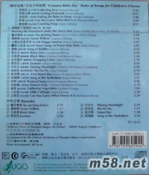 1、《鄉村童趣》兒童合唱組歌 [1] 割豌豆(四川民歌) 1:45 [2] 砍柴山歌(湖南民歌) 0:57 [3] 拍娃娃(上海民歌) 1:46 [4] 對鳥(浙江民歌) 1:04 [5] 數蛤?。ê泵窀瑁? 0:57 [6] 檳榔樹下搖網床(黃淑子詞 蘇文進曲) 3:23 [7] 采茶舞曲(周大鳳詞曲) 3:10 [8] 楊柳青(揚州民歌) 1:47 [9] 太陽出來喜洋洋(四川民歌) 3:45 [10] 贊歌比星多(湖北民歌) 2:32 [11] 猜調(云南民歌) 2:36 [12] 落水天(廣東民歌) 1:36 [13] 天黑黑(臺灣童謠) 1:18 [14] 丟丟銅仔(臺灣民歌) 2:20 [15] 茉莉花(江蘇民歌) 3:40 [16] 月光光(廣州童謠) 3:10 [17] 哇哈哈(維吾爾族民歌) 2:36 [18] 南泥灣(賀敬之詞 馬可曲) 1:31 [19] 斑鳩調(江西民歌) 2:46 [20] 牧歌(東蒙民歌) 2:19 [21] 花蛤?。ㄉ綎|童謠) 1:05 [22] 摘菜(貴州民歌) 3:20 [23] 小白菜(河北民歌) 2:29 [24] 正對花(東北民歌) 2:29 2、伴唱音樂 [25] 采茶舞曲 1:17 [26] 楊柳青 1:30 [27] 天黑黑 2:16 [28] 茉莉花 3:42 [29] 月光光 3:05 [30] 哇哈哈 2:33 [31] 南泥灣 1:32 [32] 斑鳩調