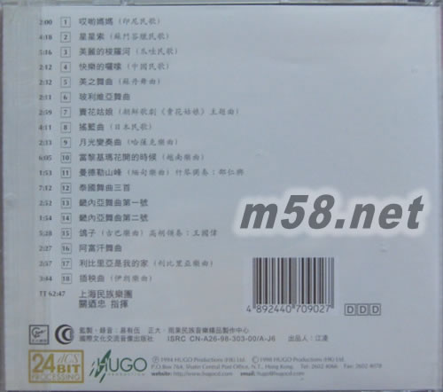 [1] 哎喲媽媽 (印尼民歌) 2:01 [2] 星星索 (蘇門答臘民歌) 4:18 [3] 美麗的梭羅河 (爪哇民歌) 5:16 [4] 快樂的羅嗦(中國民歌) 2:13 [5] 美之舞曲(蘇丹舞曲) 2:31 [6] 玻利維亞舞曲 2:12 [7] 賣花姑娘 (朝鮮歌劇<<賣花姑娘>>主題曲) 2:59 [8] 搖藍曲 (日本民歌) 4:11 [9] 月光變奏曲 (哈薩克樂曲) 2:33 [10] 當黎基瑪花開的時候 (越南樂曲) 6:05 [11] 曼德勒山峰 (緬甸樂曲 竹琴: 邵仁興) 1:52 [12] 泰國舞曲三首 7:12 [13] 畿內亞舞曲第一號 2:51 [14] 畿內亞舞曲第二號 1:55 [15] 鴿子 (古巴樂曲 高胡領奏: 王國偉) 5:28 [16] 阿富汗舞曲 2:27 [17] 利比里亞是我的家 (利比里亞樂曲) 2:58 [18] 插秧曲(伊朗樂曲) 3:43