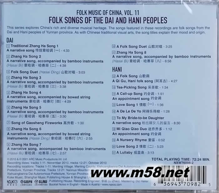 中國民歌集 (11)云南 傣族、哈尼族民歌 Folk Music of China, Vol. 11 - Folk Songs of the Dai and Hani Peoples(m58.net)