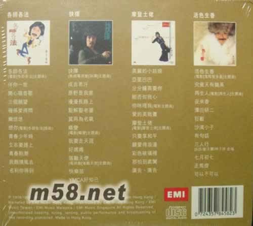 01. 各師各法(電影[各師各法]主題曲) 02. 伴你一生 03. 開心唱首歌 04. 三個(gè)愿望 05. 確係愛得悶 06. 樂悠悠 07. 想你(電影[各師各法]插曲) 08. 青春少年時(shí) 09. 立志要趕上 10. 青春熱潮 11. 我愿隨風(fēng)去 12. 名利你得到 01. 抉擇(無線電視劇[抉擇]主題曲) 02. 成吉思汗 03. 原野是我家 04. 漫漫長(zhǎng)路上 05. 點(diǎn)解娶老婆 06. 莫再為名氣 07. 蝶變(電影[蝶變]主題曲) 08. 我要走天涯 09. 好媽媽 10. 落難天使(電影劇[落難天使]主題曲) 11. 快樂苗 12. YMCA好知已 01. 美麗的小姑娘 02. 亞里巴巴 03. 分分鐘需要你 04. 能否知我心 05. 你咪理我(電影主題曲) 06. 愛的美敦書 07. 摩登土佬(電影[摩登土佬]主題曲) 08. 只要享和平 09. 愿愛得浪漫 10. 彩色破璃里 11. 那怕到處闖 12. 廣告、廣告 01. 活色生香(電影[鬼馬智多星]主題曲) 02. 究竟天有幾高 03. 再生人(電影[再生人]主題曲) 04. 夜來香 05. 澤田研二 06. 狂歡 07. 沙漠小子 08. 有句話 09. 三人行 詩詩/劉天蘭/林子祥 合唱 10. 七月初七 11. 走馬燈 12. 可以不可以