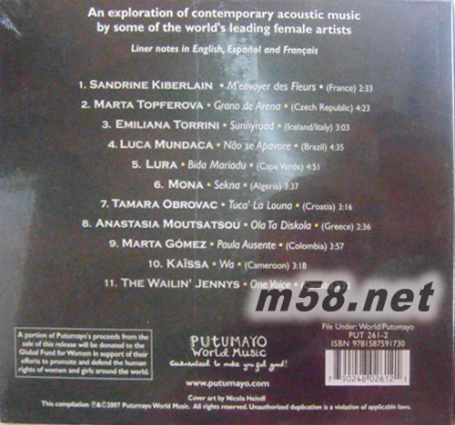 世界女聲民謠集 Women of the World: Acoustic(m58.net) 女人的心是纖細的,女人的聲音是柔美的;民謠是雋永的,民謠是充滿生命與張力的,當世界各地不同的女性藝人,以不同的傳統音樂唱出自己特色的民謠時,就是一篇再絕美不過的彩圖。世界音樂第一品牌Putumayo,繼廣受好評得獎無數的「居爾特世界的女人」、「女人心音樂情」、「非洲女伶」及「拉丁美洲女聲民謠」等以「女聲」為主題的專輯之后,集結了全球最具代表性的女聲民謠藝人,跨越國家、地域、種族、語言及文化籓籬,以Acoustic原汁原味不含電子合成錄音技術的方式,用簡單的撥弦及打擊樂器,透過女聲細膩的嗓音,以女性過往如何爭取平等、正義、愛與和平的心聲為主軸,終於選在國際婦女節推出了這張終極之作「世界女聲民謠集」。 此集的女性藝人可謂全球在Acoustic領域中的一時之選,包括主演超過20部知名電影的法國演員Sandrine Kiberlain(凱柏琳)演而優則歌的稀有作品;2005年奪得加拿大朱諾最佳傳統音樂獎的知名女聲團The Wailin’ Jennys,超優美民謠曲風世間難得;曾在電影「魔戒雙城奇謀」演唱”The Gollum’s Song”的才女,最具代表暢銷曲也收入其中;捷克出生旅居智利的才女Marta Topferova,以其獨特清新卻強烈的詞曲,重現民謠抗議及正義的色彩;哥倫比亞甜美女聲Marta Gómez,以智利知名著作主角為名譜出了浪漫隨想曲”Paula Ausente”,細膩詮釋出母愛的光輝;另外來自非洲喀麥隆首席女星Kaïssa的作品”Wa”,以非洲特有撥弦樂器及沙鈴,輕快唱出對已逝姐妹的感恩之情;希臘的Anastasia Moutsatsou也以拿手的熱情地中海樂風快樂詮釋出歡欣鼓舞之情。不論是內斂、自省、抗議,亦或是闡述女性纖細及浪漫柔情,女人不只唱給女人聽。