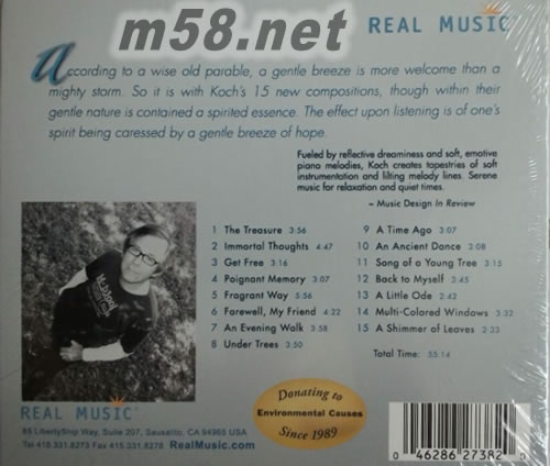 Gentle Spirit 溫柔細語 新世紀純音樂(m58.net) 本專輯REAL唱片公司官方試聽網(wǎng)址:片段http://www.realmusic.com/shop/gentle-spirit/prod_6.html 來自德國、受過正統(tǒng)音樂訓練的頂尖鋼琴家 Bernward Koch,在其所創(chuàng)作的曲子總是能展現(xiàn)出大師級的純熟風范,音樂中所蘊涵的細膩精巧之處教人為之驚嘆不已。樸素的旋律從播放器中這樣飄揚而出,你覺得是那樣的熟悉,就像已經(jīng)聽了多年。但它們又是如此的新鮮宜人。Bernward Koch 是一個只使用少量音符的旋律大師。