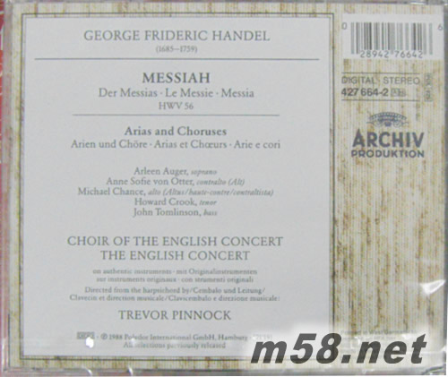 韓德爾:神劇彌賽亞&著名詠嘆調與合唱曲Handel:Messiah& Arias&Choruses(m58.net) 這套《亨德爾:彌賽亞》由Archive唱片公司發行于1989年,特雷沃•平諾克指揮英國協奏團及合唱團演奏錄制。 亨德爾為著名的英籍德國作曲家,生于德國哈勒,師從管風琴家查豪學習作曲,后在教堂內任管風琴師及藝術指導。因愛世俗音樂,亨德爾乃于1703年遷居漢堡——當時唯一有民族歌劇的德國城市,開始從事歌劇的創作。1706年后,亨德爾在漢堡威爾及倫敦兩地進行創作,不久成為英國的音樂權威人士。1717年定居英國,1726年,亨德爾加入英國籍。 他一生共創作了《阿爾西那》、《奧蘭多》等46部歌劇,除五部外,其余均在倫敦創作。從30年代末開始,從事于沒有舞臺表演的清唱劇創作。其間亨德爾共寫了32部清唱劇,絕大部分是在英國創作的,對英國的音樂產生了深遠的影響。他的代表作有管弦樂曲《皇家水上音樂》、《皇家焰火音樂》,清唱劇《彌賽亞》等,其中《彌賽亞》中的《哈利路亞》流傳最為廣泛。 《彌賽亞》這一清唱劇作于1741年9月,作曲家亨德爾在一種不可遏止的熱情沖動下,只用了20多天就寫出了這部注定要成為經典之作的清唱劇《彌賽亞》。這部作品是作者“流著眼淚寫作”而成的,同樣也打動了1743年在倫敦音樂廳觀看首演時的所有聽眾,甚至英王喬治二世在聽完第二幕終曲《哈利路亞》這一合唱后,起立以示敬意。這一舉動竟形成了傳統,直到今天,人們在現場欣賞合唱《哈利路亞》時,都必須全體起立以示敬意。 “彌賽亞”一詞源于希伯萊語,意為“受膏者”。后被基督教用于對救世主耶穌的稱呼。全劇分三部分,共有序曲、詠嘆調、重唱、合唱、間奏等57首分曲。第一部分敘述圣嬰耶穌的誕生;第二部分是關于耶穌為拯救人類,四處傳播福音以及受難而被釘死于十字架上的經歷;第三部分則是耶穌顯圣復活的故事和贊美詩。這是亨德爾少數完全表現宗教內容的作品中最出色的一部,實際上其中對音樂的戲劇性和人性的宣揚遠勝于對宗教的虔誠感情。全劇為主調和聲音樂風格,以旋律優美、和聲洗練見長。西西里民間樂器風笛的使用在當時是大膽而新穎的。由于其中不少分曲具有很高的技術訓練價值和藝術性,至今仍在音樂會和聲學教學中被廣泛采用。整個作品經典迭出,美不勝收。 英國本土古樂指揮大師特雷沃•平諾克與他親手創立的英國協奏團所演繹的巴洛克作品在專業評論界是擁有極高評價的。平諾克對古樂深厚的研究以及英國協奏團清澈、明快的音色,在唱片中顯露無遺。特雷沃•平諾克的演繹既具有德國式的嚴謹,又具有英國式的清新和優雅。作為深受60、70年代風行歐洲的古樂運動影響的一員,平諾克在組建英國合奏團之初就確立了仿古樂器在樂團中的主導地位。除了使用仿古樂器,他們還盡可能使用古代的演奏方式,追求一種真實而質樸的演奏效果。他曾經說過這樣的話:“歷史是有趣的,但在舞臺上歷史幾乎沒有它的一席之地,而對于我們音樂家而言,古樂器已經超越了歷史而成為音樂表情的有機成分。” 英國協奏樂團為英國最優秀的室內樂樂團之一,1973年由平諾克和斯坦奇等人創建。樂團偏重于巴洛克時期的音樂,追求“原本”的真實和演奏風格的純正。他們認真地研究和考證樂譜和各種文獻,在維多利亞和阿爾伯特博物館的支持下,利用館藏多年的古樂器來演奏,力求獲得和展現巴洛克時期音樂的精髓和原始風貌。20多年來,這支古樂團從小到大、不斷發展,除每年定期到歐美及亞洲等地舉行音樂會外, 還經常在許多世界著名的音樂節上登臺,像雪斯維格—霍斯坦音樂節、圣西西里亞音樂節、愛丁堡音樂節等。1988年,英國協奏樂團在薩爾茨堡音樂節上演出亨德爾的《彌賽亞》,受到好評。此后,便成為該音樂節的常客。