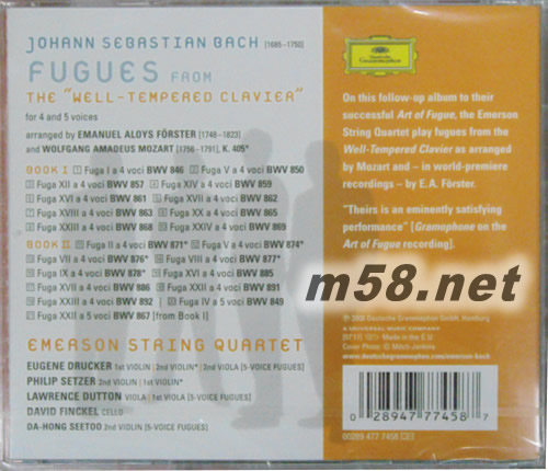 巴哈:賦格 J.S.Bach:Fugues 四重奏(m58.net) 「賦格」起源於十五世紀末期復調聲樂曲中的模仿進入,到了十七世紀成為一種獨立的曲式,指的是在同一個主題上構成的多聲部對位作品。它的處理方式非常多樣化,作曲家的基本功力往往可以從他創作的賦格曲中明顯聽出來。在古典音樂史上,巴哈賦格曲的變化性一直是前無古人、后無來者,特別是為鍵盤樂器創作的48首前奏曲與賦格,千變萬化的處理手法一直是后代作曲家景仰的典范。 雖然巴哈沒有創作弦樂四重奏,但是弦樂四重奏四把音質相近,可是各有音色特點的弦樂器非常適合處理像賦格這樣多聲部行進與變化、模仿的作品。這一張專輯的曲目全部改編自48首前奏曲與賦格中的21首賦格曲,其中最后兩首樂曲更改編成更復雜的五聲部賦格,由自1980年代早期就與艾默森弦樂四重奏密切合作的古典唱片製作人、錄音工程師與小提琴家司徒達宏擔任第二小提琴手。巴哈的原作是為所有的調性各寫一首前奏曲與賦格,但是為了配合弦樂器間的共鳴效果以及演出限制(例如:弦樂器無法演奏升D小調),莫札特等作曲家曾經把其中數首曲子移調演出,本張專輯也做了類似順應弦樂器的處理,但是正如艾默森弦樂四重奏的團員所言,「當我們進一步探索出一些不明顯的和聲與節奏變化時,我們覺得,自己是忠於巴哈的原始構想。」