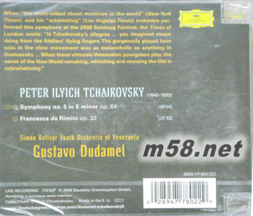 老柴:第五號(hào)交響曲&交響幻想曲黎密尼的弗蘭西斯卡Tchaikovsky 5&Francesca da Rimini(m58.net) 指揮:GUSTAVO DUDAMEL 柴可夫斯基:第五號(hào)交響曲、交響幻想曲《黎密尼的弗蘭西斯卡》 ⊙杜達(dá)美指揮 / 委內(nèi)瑞拉玻利瓦爾青年管弦樂(lè)團(tuán) 雖然委內(nèi)瑞拉與俄羅斯的地理位置遙遠(yuǎn),但是柴可夫斯基的作品卻一直是委內(nèi)瑞拉音樂(lè)教育體系里重要的一部分 。杜達(dá)美認(rèn)為,第五號(hào)交響曲終樂(lè)章里隨處可聞或者優(yōu)美,或者戲劇性的變奏樂(lè)段讓它被譽(yù)為柴可夫斯基寫(xiě)過(guò)最精彩的進(jìn)行曲之一也當(dāng)之無(wú)愧。雖然交響曲以嚴(yán)峻的低音管獨(dú)奏開(kāi)始,演奏起全曲,卻像是在蜂蜜池中游泳般,適合年輕的樂(lè)團(tuán)以清新的聲音來(lái)演奏每一個(gè)和弦與旋律。取材自但丁《神曲》的《黎密尼的弗蘭西斯卡》是柴可夫斯基早期的作品,反映出作曲家內(nèi)在靈魂的痛苦與渴望。杜達(dá)美會(huì)愛(ài)上這部作品的原因始於一部影片:委內(nèi)瑞拉文化部長(zhǎng)、國(guó)會(huì)議員、經(jīng)濟(jì)學(xué)家、音樂(lè)家與教育家、社會(huì)改革家荷西‧阿布雷,於1976年初創(chuàng)樂(lè)團(tuán)時(shí)指揮這部作品的錄影。當(dāng)玻利瓦爾青年管弦樂(lè)團(tuán)的音樂(lè)家們看到這部影片后,樂(lè)團(tuán)立刻決定「必須」演奏這部作品,並且把這一張唱片獻(xiàn)給為了在委內(nèi)瑞拉創(chuàng)辦樂(lè)團(tuán)而努力不懈的荷西‧阿布雷。