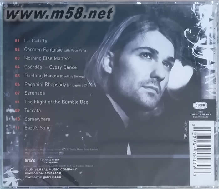 1. La Califfa 2. Carmen Fantasie Composer:BIZET, GEORGES 3. Nothing Else Matters (Metallica) 4. Csardas Gypsy Dance Composer:MONTI, VITTORIO 5. Duelling Strings (from the film "Deliverance") 6. Paganini Rhapsody (on Caprice 24) Composer:PAGANINI, NICCOLO 7. Serenade (Garrett) 8. Flight of The Bumble Bee Composer:RIMSKY-KORSAKOV, NIKOLAI 9. Toccata (Garrett) 10. Somewhere (from Bernstein's "Westside Story") Composer:BERNSTEIN, LEONARD/伯恩斯坦 11. Eliza's Song (Garrett)