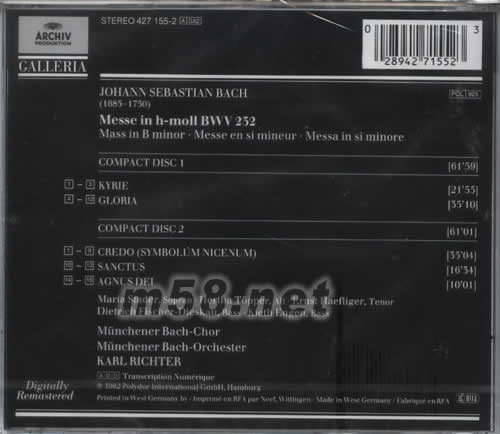 巴赫 MESSE IN B MINOR(m58.net) 指揮:KARL RICHTER 這套《巴赫:b小調彌撒》由DG唱片公司發行于1989年,卡爾?李希特指揮錄制。 巴赫的《b小調彌撒》(BWV 232)無論在設計、規模及表現上,比起其他作曲家的作品都來得崇高。它也是巴赫音樂中,為理想而非實用目的而創作的例子之一。因此它代表巴赫試圖以一部完美的典范作品來總結彌撒曲的傳統,并留給后代詮釋圣樂本質的最佳范例。此曲是巴赫在萊比錫的長期居留時所寫的,創作時間很長,直到巴赫垂暮之年才整理成完整的一部彌撒曲。最早完成的是1724年譜成的《圣哉經》,而《垂憐經》與《榮耀經》則取自巴赫獻給德累斯頓的薩克森選侯的一首彌撒曲。最后主要追加部分是彌撒的《信經》,是全曲拱門形結構的基石,其本身就是極為對稱的拱形結構,于1748-1749年完成。 巴赫一生中未曾聽過此曲的完整演奏。盡管此曲各樂章的風格多樣,包括一些刻意為之的古樂成份,《B小調彌撒》仍超越了其來源的不一致。在和聲結構與整體規劃有強有力的一致性,更可感受到樂音中,一股動人心魄的美感。此曲遵循那不勒斯清唱劇式的彌撒曲模式,像歌劇般分成合唱與獨唱兩部分,共27首曲子。全曲的支柱是9部大型的D大調贊美合唱,加上頌揚的小號及鼓聲伴奏。巴赫以合唱、詠嘆調及二重唱搭配,有的還伴以樂器獨奏。值得注意的是,在結構上《B小調彌撒》既不偏向標準天主教禮拜儀式,也不傾向路德教派,正如樂評家蓋林格指出,此作反映出“整個基督教世界團結一致的心態”。 卡爾?李希特(Karl Richter)為德國指揮家,專長于演繹巴赫的作品。李希特的演奏風格,源自萊比錫樂派傳統,強調戲劇性與效果,在演奏時不僅有力度,而且剛柔相濟,有宏大的氣勢又有美妙的音色,有極大震撼力。面對戰后蓬勃興起以仿古樂器演奏巴羅克音樂以力求原樣再現的古樂風潮,李希特并沒有隨波逐流,他的樂團仍使用現代樂器。他把精力主要用在研究巴赫音樂樂譜的內涵上,準確把握每一個音型的表情及含義,在“神”而不是在“形”上去再現巴赫。