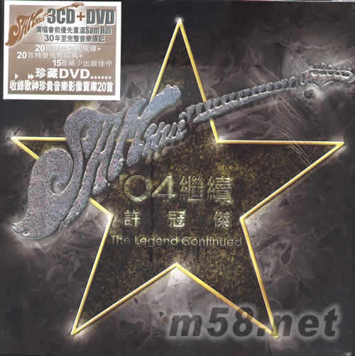 04繼續許冠杰(m58.net) 歌神再現,許冠杰 《'04 繼續》! 12年來,他的歌從未間斷地回放; 今年,帶給我們的第一個喜訊,推出—《'04 繼續》精選大碟! 3CD收錄許冠杰歌唱事業里程碑55名曲,DVD收錄TVB從未出版經典MV,四碟內容,單碟價,齊來慶祝歌神回歸樂壇!